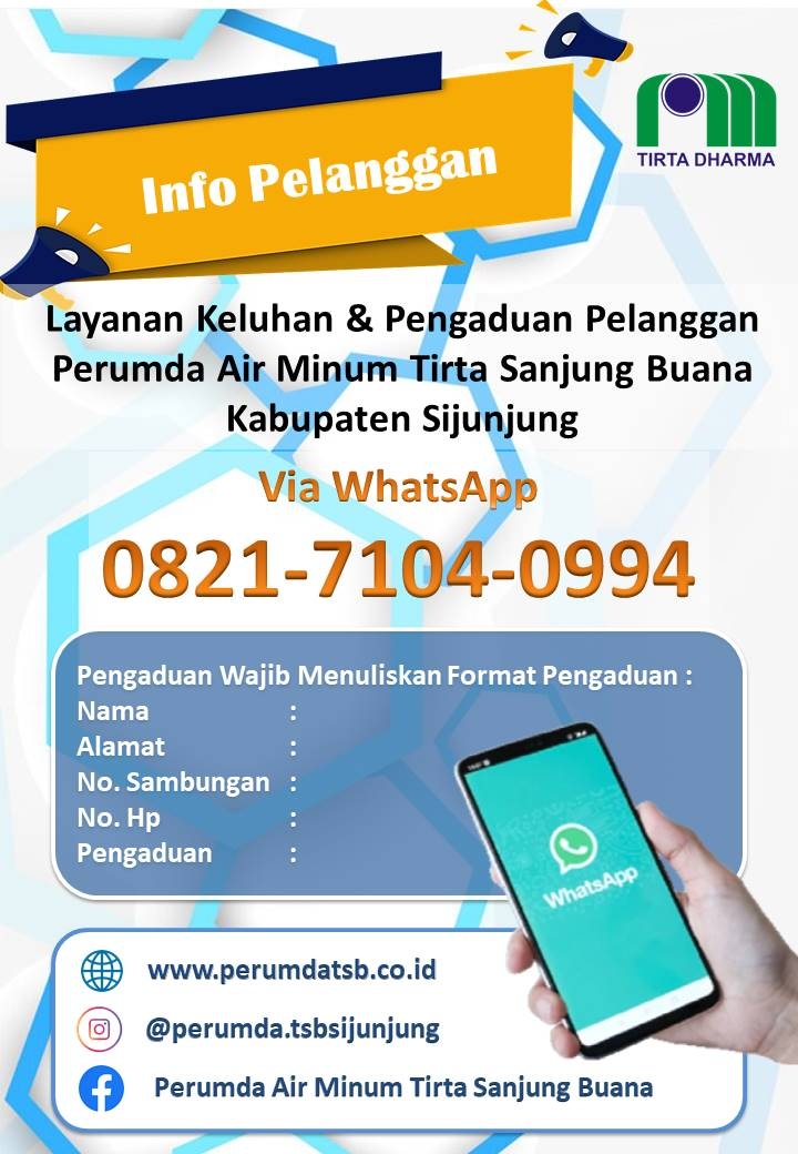 Untuk Segala bentuk Pengaduan Pelanggan sudah bisa dilakukan Via Aplikasi WhatsApp, pelanggan Perumda Air Minum Tirta Sanjung Buana bisa menghubungi nomor 0821-7104-0994..